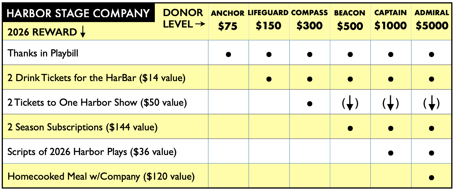 The main return on your investment in the Harbor is a theater full of artistry and adventure, but we also like to thank to our donors with some tokens of our appreciation.